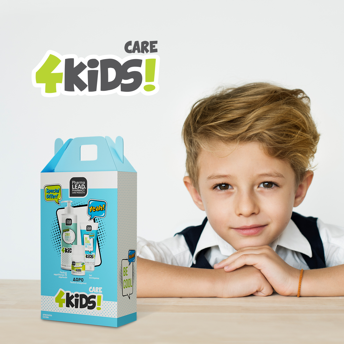 Πακέτο 4KIDS για αγόρια, περιλαμβάνει αφρόλουτρο-σαμπουάν 2 in 1 Bubble Fun 500ml, παιδικό τζελ χτενίσματος Be Cool Styling Gel & δώρο το αποσμητικό Hurry up roll-on.