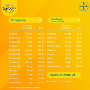 Το συμπλήρωμα διατροφής Supradyn Energy Boost περιέχει συστατικά που συμβάλλουν στην ενεργειακή φόρτιση του οργανισμού και τη μείωση της κούρασης.